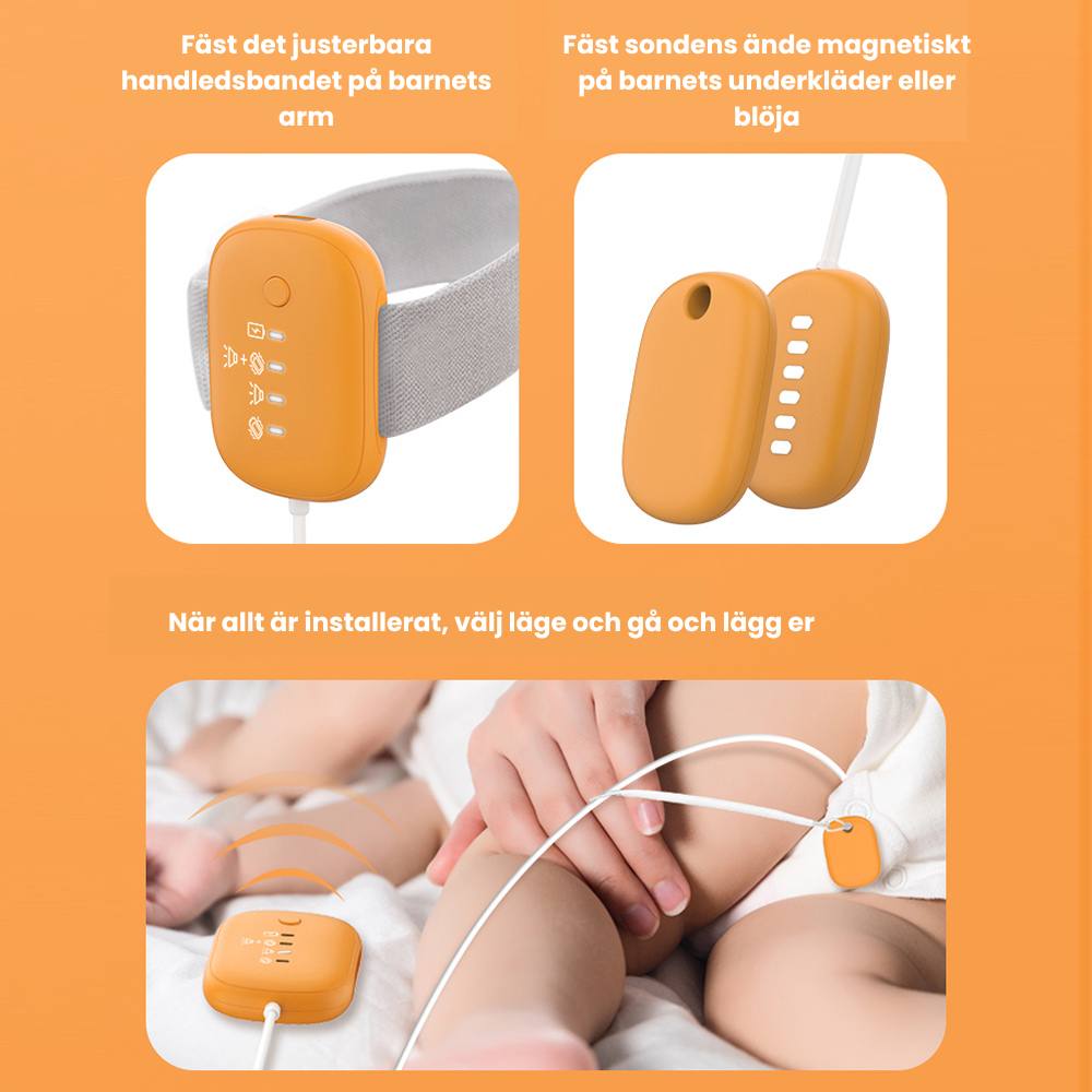 Fäst arm-enheten bekvämt på barnets överarm och placera fuktsensorn i underkläderna där de första dropparna kommer. Det ger snabbast och mest träffsäkra signaler.